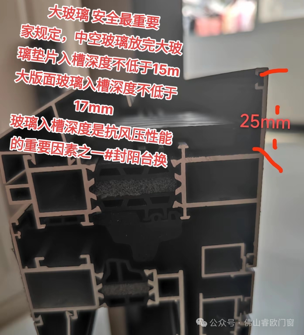 玻璃入槽深度决定抗风能力。国标要求玻璃入槽深度≥15毫米,优质产品可达24毫米(如视频中案例)。深度越深,玻璃固定越稳,大风天气更不易被刮掉;反之,若入槽仅1.1公分且压线过薄,大玻璃存在安全隐患。